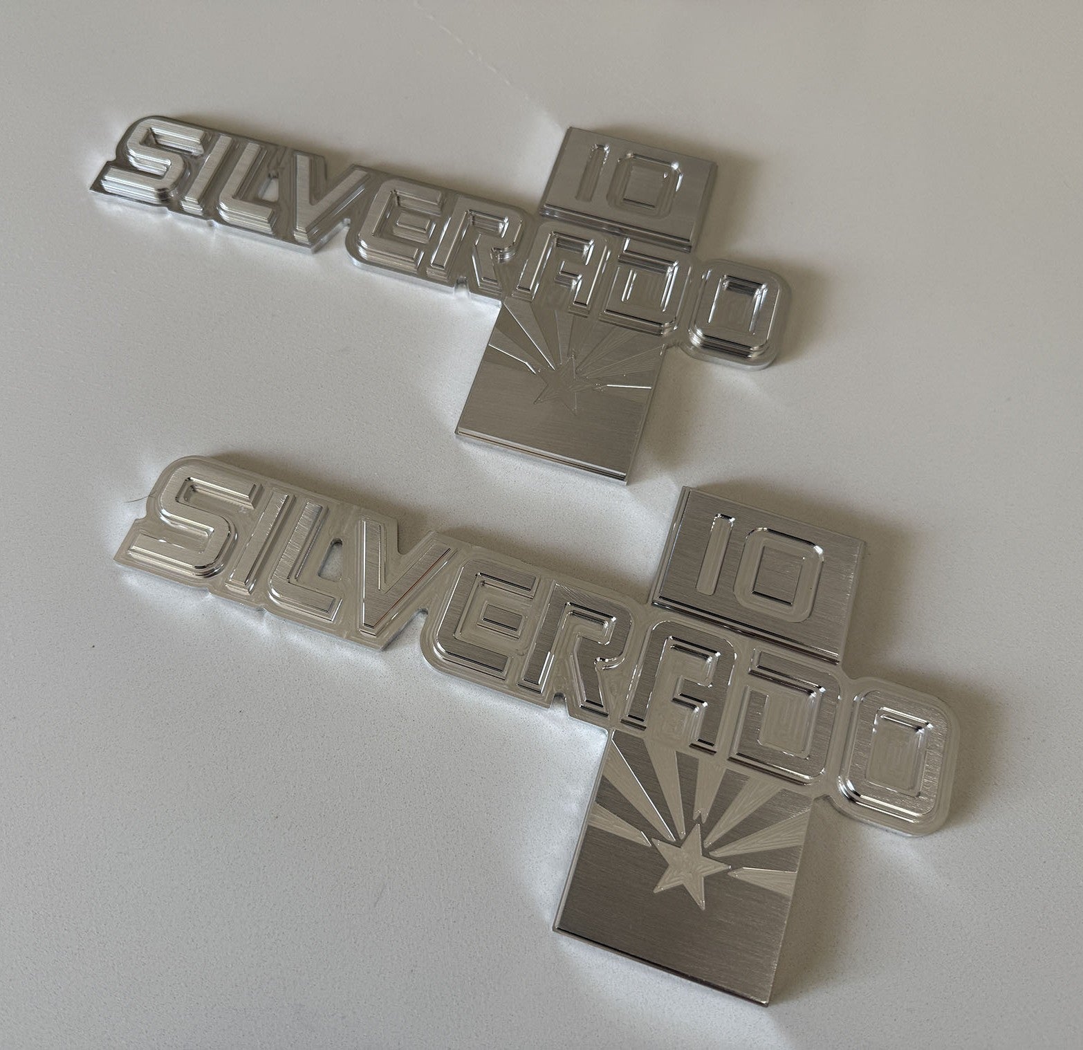Pair of "Silverado 10" CNC machined billet aluminum fender badges that fit 1981-1987 Chevrolet Silverado's. Mounting hardware included or they can be installed using 3M VHB tape. Made in the U.S.A.